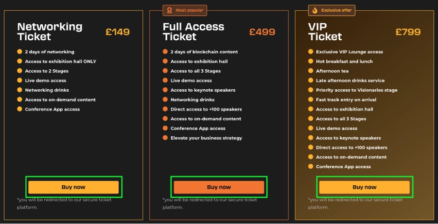 Various access options are available for this year’s London Blockchain Conference. If you’re travelling solo or in a group, you can choose between three different tickets, each granting more features than the last.